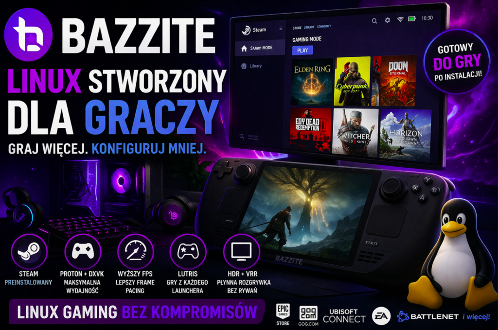 Jeszcze kilka lat temu granie na Linuxie było traktowane bardziej jako ciekawostka niż realna alternatywa dla M$. Dziś sytuacja wygląda zupełnie inaczej — a jednym z najmocniejszych dowodów na tę zmianę jest system Bazzite.