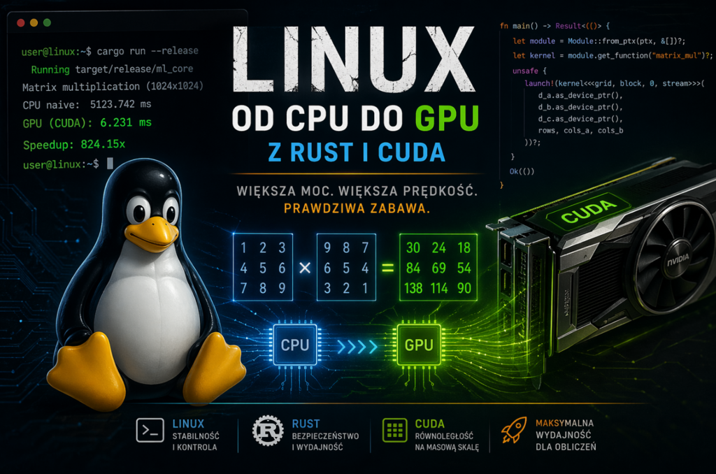 Spędziłem trochę czasu na szukaniu alternatyw. Wiele wyników wskazywało na ndarray – wydajną bibliotekę Rust do pracy z wielowymiarowymi tablicami. To świetne narzędzie, ale używanie go „z pudełka” wydawało mi się jak oszustwo – kolejna magiczna czarna skrzynka. Moim celem była nauka od podstaw, więc gotowe rozwiązania odpadały. Natrafiłem wtedy na rust-cuda, zestaw narzędzi do integracji programowania GPU z Rust.